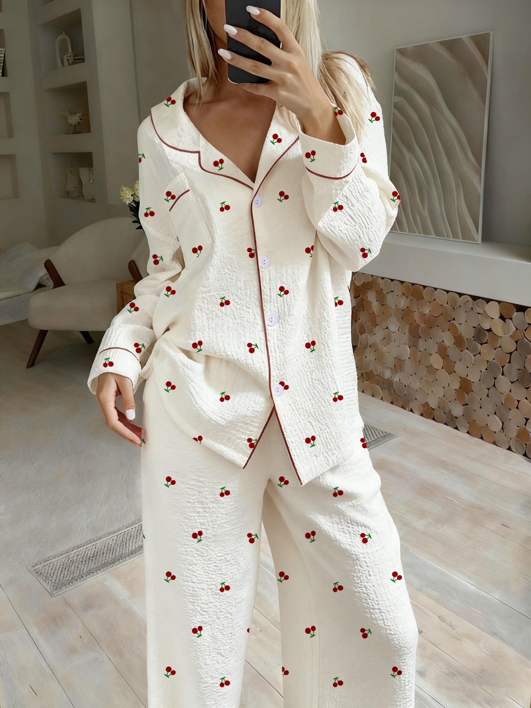 De Reah pyjamaset met lange mouwen en kersenprint heeft een relaxte pasvorm die soepel om het lichaam valt voor een comfortabele, flatterende look. De lange mouwen en lange broek bieden bescherming tegen koelere nachten, terwijl de speelse kersenprint een frisse, vrouwelijke touch toevoegt. Deze pyjamaset is ideaal voor gezellige avonden, rustige ochtenden en ontspannen weekenden thuis en combineert stijl met alledaags gemak.